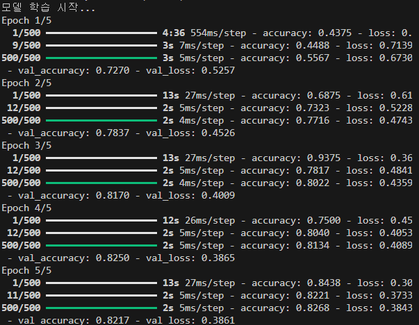 현재 각각 10000개의 데이터를 학습시켰고 모델 학습 시간은 대략 11초 정도가 걸리는 것 같다.